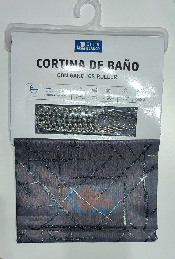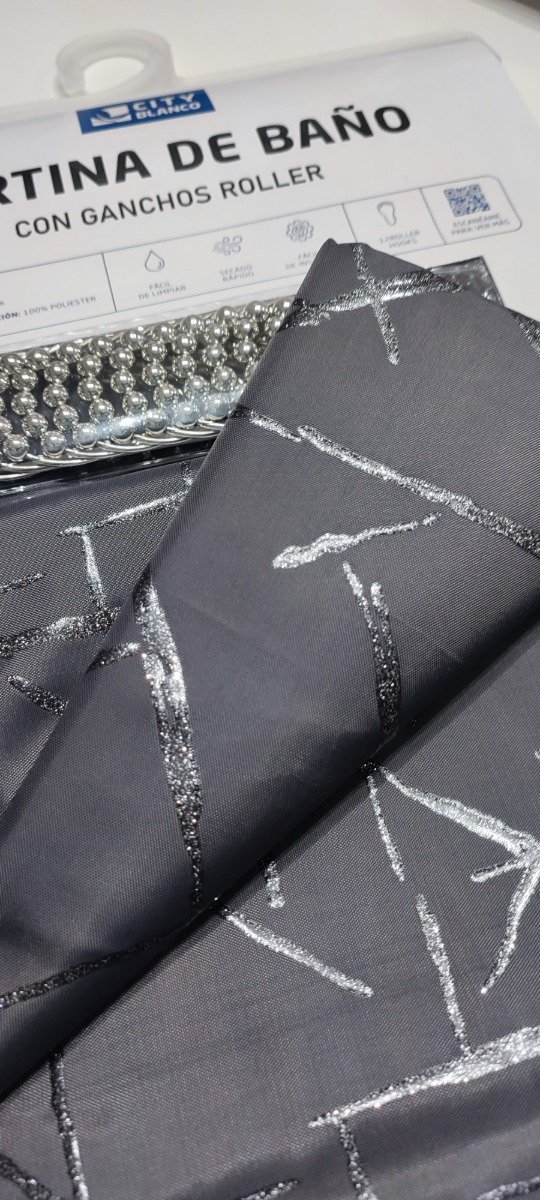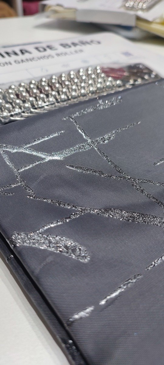 Cortina de tela teflonada con estampados plateados .